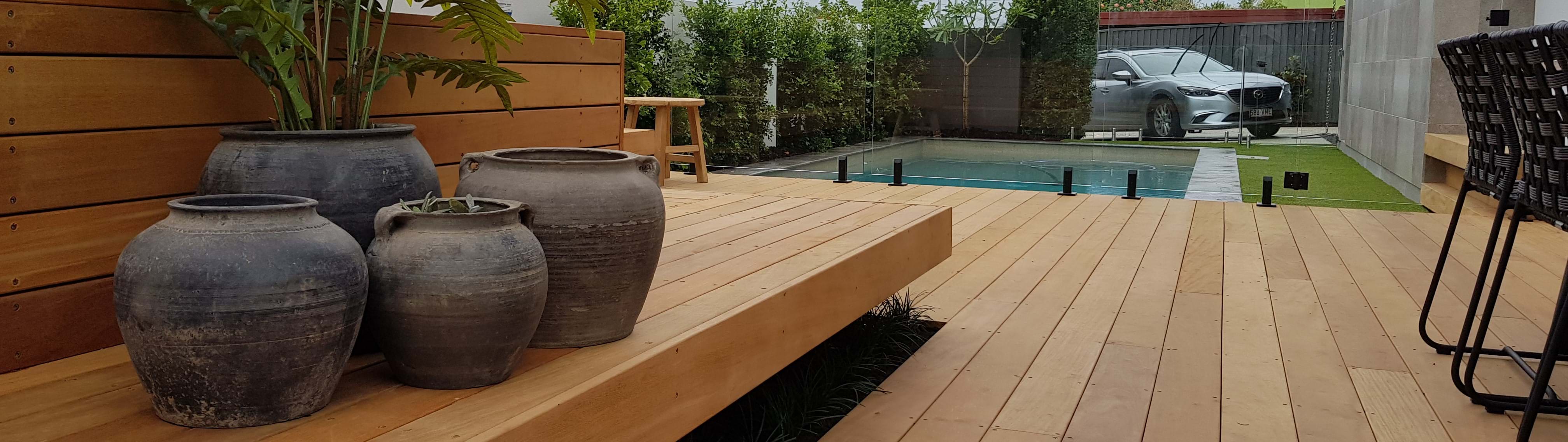 A stylish take on a pool and entertaining area with timber deck and seating garden area.