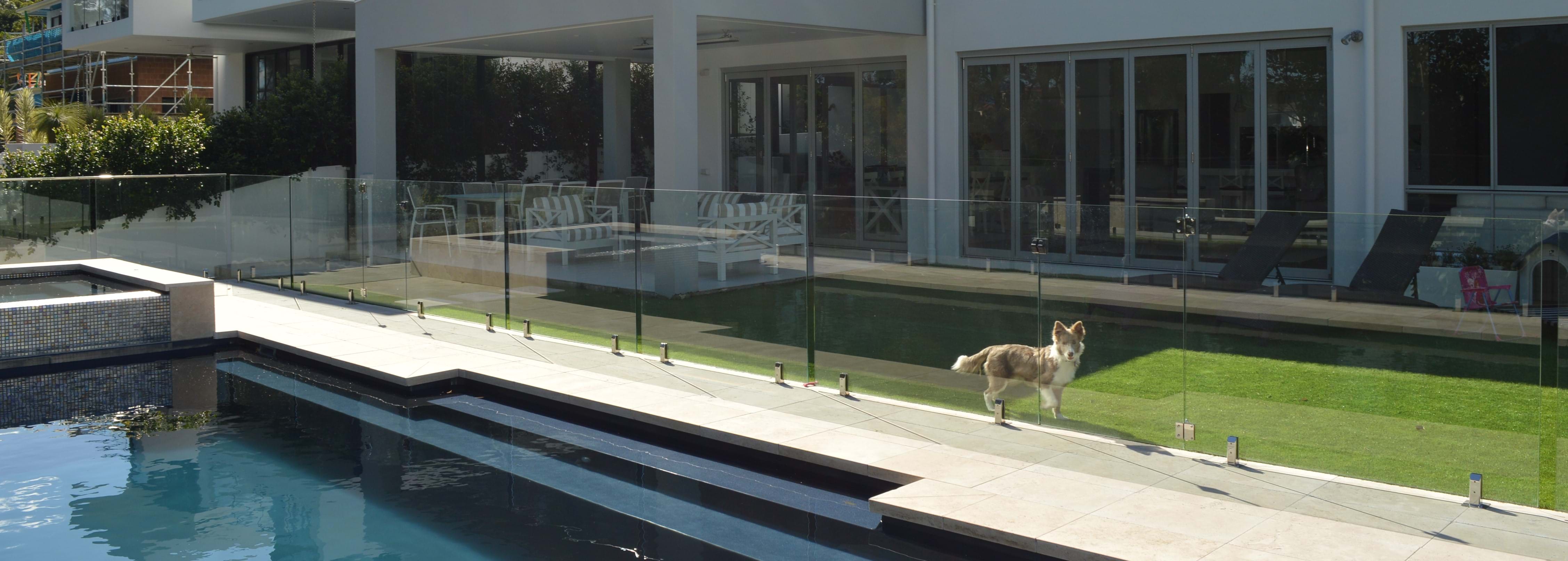 A tricky backyard pool build with huge retained pool shell, travertine tiling, glass fencing, artificial turf all on a difficult sloped backyard.